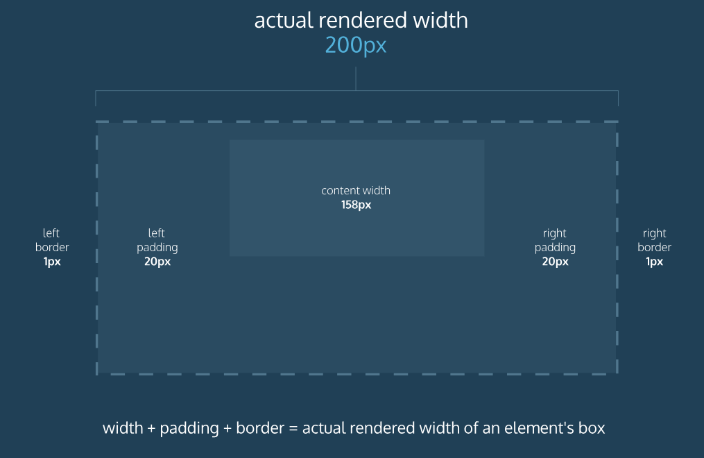 위 코드는 모든 HTML 요소들의 박스 모델을 border-box로 초기화한다. 이 박스 모델은 앞에서 언급하였던 content-box모델에서의 차원과 관련되어 나타났던 문제점들을 해결한다. 이 박스 모델에서, height와 width는 고정된다. 테두리의 굵기와 패딩은 이 고정된 크기 안에 포함되고, 즉 박스의 차원은 변하지 않게 된다