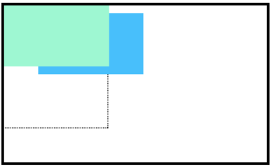 위 코드에서 우리는 위쪽 박스의 z-index를 2로 설정하고 position을 relative로 설정하였다. 왜냐하면 z-index 속성은 디폴트 포지션(static)에서 작동하지 않기 때문이다. 2의 z-index는 아래쪽 박스의 z-index의 값인 1 보다 크므로 위쪽 박스를 화면 앞으로 이동시킨다. 아래 그림은 이러한 배치의 결과를 보여준다