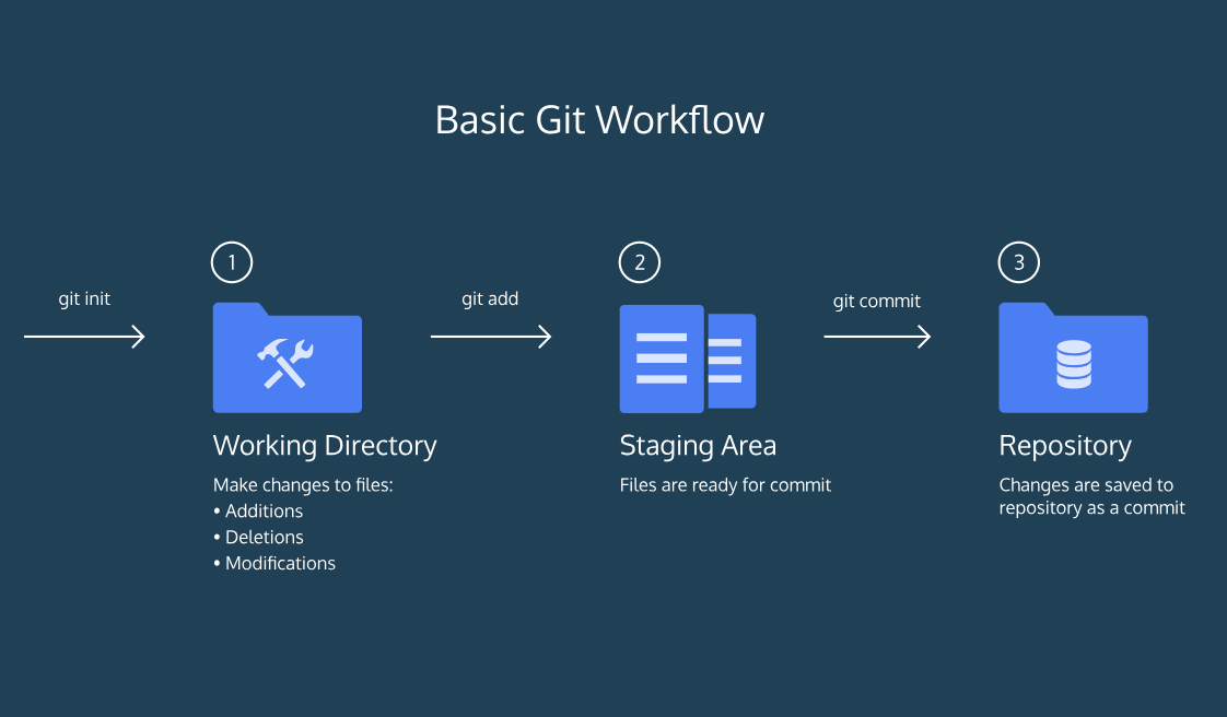 Git의 기본적인 workflow는 Working Directory에서 파일들은 편집한 후 Staging Area에 추가한 뒤, 마지막으로 변화들을 Repository에 저장하는 방식으로 흘러간다. Git에서는 Repository에 저장된 변화들을 Commit(커밋)이라고 하는데, 커밋에 대해선 나중에 더 자세히 알아보도록 하자.