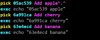 exec 명령은 각 커밋이 rebase 된 후 실행될 쉘 명령을 지정할 수 있다. 필자의 경우 다음과 같이 각 커밋 리스트 사이에 exec 명령을 추가해서 커밋의 해쉬값과 메시지를 echo 하게 하였다