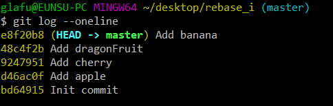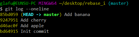 이제 이 커밋 리스트를 rebase 해보도록 하자. 이때 rebase 할 커밋의 범위를 지정해야 하는데, 이를 일반화한 명령은 다음과 같다